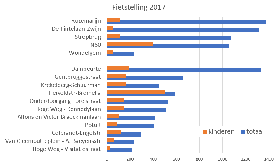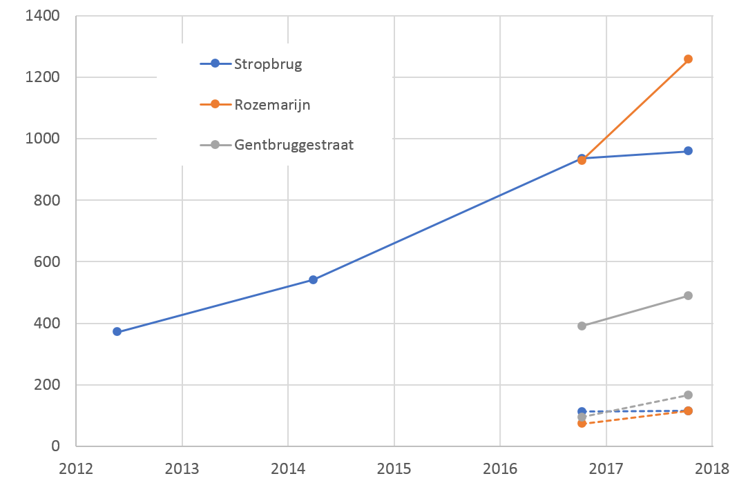 - aan de telpunten Stropbrug, Rozemarijnbrug en Gentbruggestraat waar vorige jaren ook geteld werd, groeit de stroom fietsers nog altijd aan.