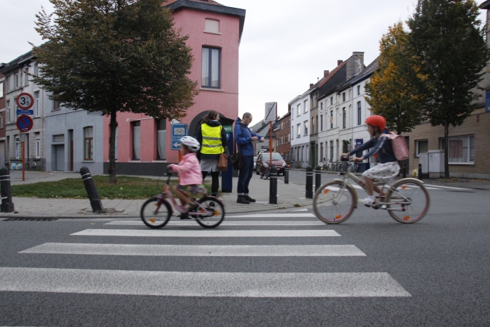 - Voor het eerst werd geteld in de Groenstraat, aan de ingang van de kleuterschool van Edugo. De situatie daar is schrijnend: een onoverzichtelijk kruispunt waardoor auto's en fietsende kinderen net naar elkaar toe gedreven worden. Geen plaats waar fietsertjes die willen oversteken zich apart kunnen opstellen van de auto's die doorrijden. Eén ongelukkige parkeerplaats die het zicht op overstekende kinderen belemmert. Een gemachtigd opzichter die alles in goede banen, verdiende zeer veel respect. Haal die persoon weg, en het wordt helemaal chaos. Dit punt zal volgend jaar zeker speciale aandacht krijgen van Velodroom, want dit is een (school)voorbeeld van hoe een schoolomgeving net niet mag zijn. Mits enkele kleine ingrepen zijn er al snel verbeteringen te realiseren.